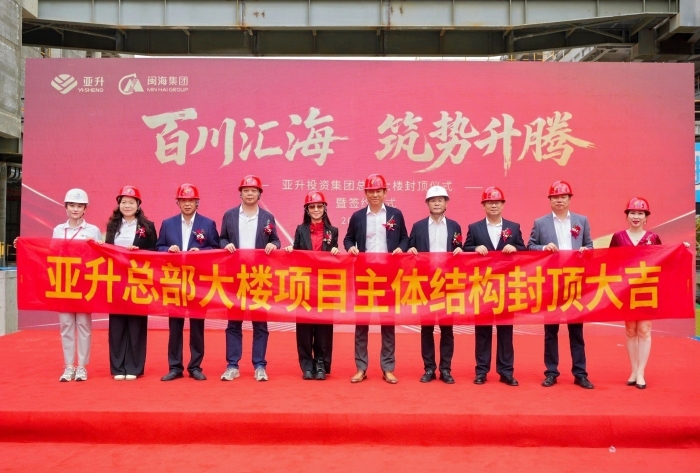 在仓山区委书记魏邦仲、省市区相关部分、亚升集团高层及各界嘉宾见证下,,,,,,,,亚升大楼完成最后一方混凝土浇筑,,,,,,,,巍然屹立三江之畔。。。。。。。。作为片区首座封顶的200米超高层修建,,,,,,,,亚升大楼以“都会绿谷”为理念,,,,,,,,重塑福州天涯线。。。。。。。。
